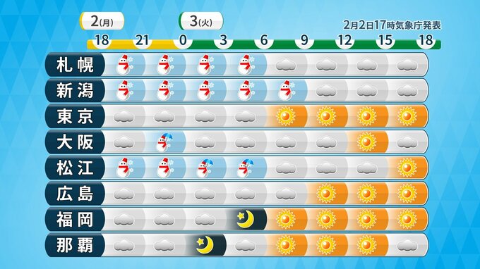 2月前半は気温のジェットコースター 3月並みの陽気から真冬の寒さに 衆院選投開票日は全国的に強い寒気 まとまった雪の可能性も 中国放送 2026年2月2日(月) 18:40 国内 天気 2日(月)は上空の寒気の影響を受けて、日本海側中心に雪が降っている所があります。3日(火)も寒気が残り、北日本や北陸、西日本の日本海側では、雪が降るところがあるでしょう。