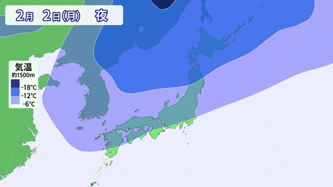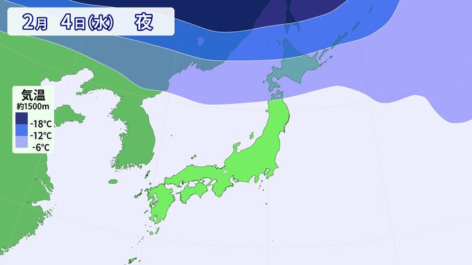 各地で雪を降らせている原因の寒気。上空1500m付近を見てみると、2日(月)夜は、平地で雪を降らせる目安の-6℃以下の寒気が日本の南岸近くまで覆っています。4日(水)になると、北海道の南まで北上し、寒気の影響を受けにくくなる見込みです。そのため、4日(水)~6日(金)頃まで、全国各地で気温が上昇し、3月並みの春の陽気になる所もあるでしょう。このまま、ずっと高温傾向で春に向かうかというと、違うようです。