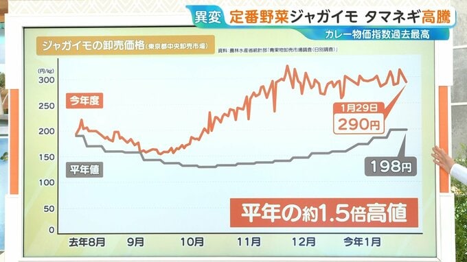 ジャガイモの卸売価格は1月29日の価格で290円/kgで、平年の約1.5倍の高値になっています。