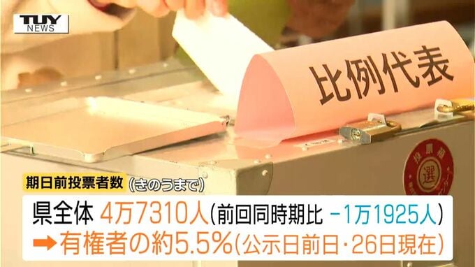 これは(公示日前日・26日現在)有権者のおよそ5.5%にあたります。前回の衆院選の同じ時期に比べ1万1925人減少しています。