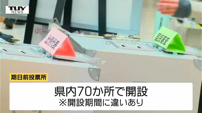 期日前投票所は開設期間に違いがあるものの各市町村の庁舎や公共施設のほか、商業施設など県内70か所で開設されます。