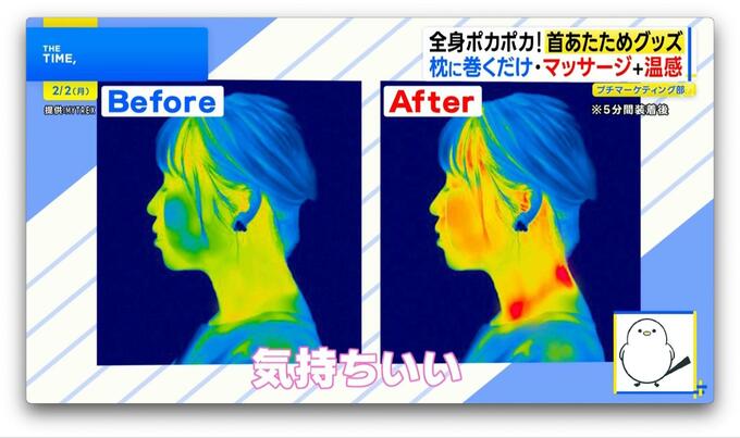 「首には頚動脈というかなり太い血管がある。血液は熱も運んでいるので、“多い血流で全身を効率よく温めてあげることができる”。温めるだけでもコリや痛みなどは取りやすくなる」