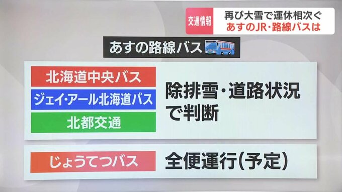 北海道中央バス、ジェイ・アール北海道バス、北都交通は、3日の除排雪の状況や道路状況に応じて運行するか判断します。じょうてつバスは全便運行する予定ということです。