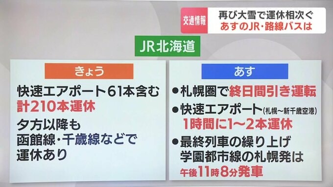 札幌圏を中心に、雪の影響が続いていますが、今後の交通機関の運行状況はどうなるのでしょうか。