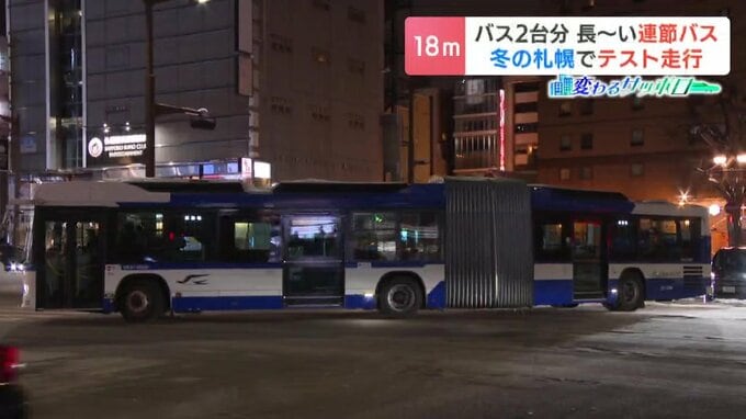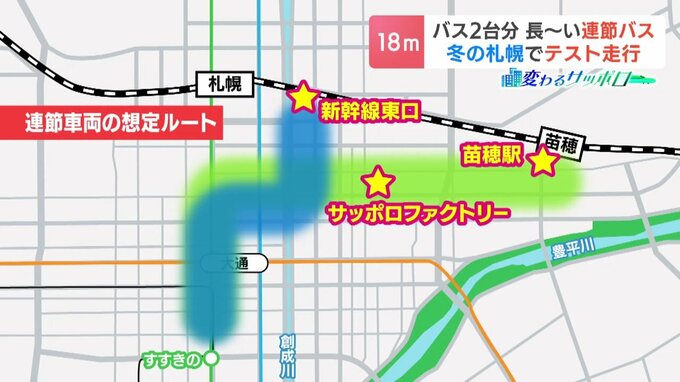 今回のテスト走行では、連節バスの運行が想定される北3条通りやススキノ、札幌駅前通りも走りました。