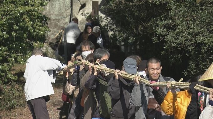 2日は県外からも参拝者が訪れ、約300人がそれぞれ願いを込めながら長さ170メートルの綱を、ご神体の巨大な岩から七里御浜海岸まで一丸となって引き延ばしました。