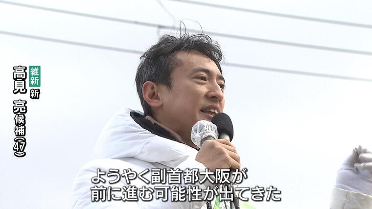 (維新・新人 高見亮候補 47)「今回、日本維新の会が政権与党に入ることで、ようやく副首都大阪が前に進む可能性が出てきた。大阪を東京並みの都市にする。東京のバックアップになれる都市にする」