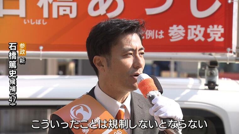 (参政・新人 石橋篤史候補 47)「いまどんどん人手が足りないからと言って外国人入れているが、こういったことは規制しないとならない。日本人を増やさないとならない。少子化対策しっかりしないとならない」