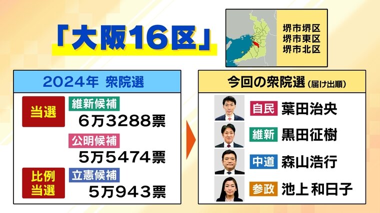 前回2024年の衆院選では、維新の候補が6万3288票を獲得し当選。その他、公明(5万5475票)・立憲(5万943票)がいて、立憲の候補が比例で当選しました。