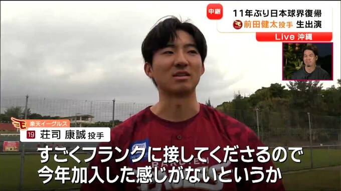 楽天イーグルス 荘司康誠投手:「すごくフランクにこう接してくださるので、今年から加入した感じはないというか、前からよくしてもらってる先輩みたいな感じの空気感でやってくださりますね。(球種について)マエケンさんにちょっと教えてもらいたいなっていう部分はあるので、もうちょっとしたら聞いてみたいと思います」