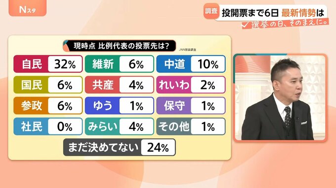 自民24%、維新6%、中道2%、国民6%、共産4%、れいわ6%、参政14%、みらい6%、決めていない26%