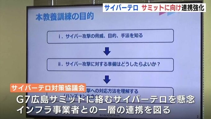 県警によりますと、ことし、県内では重要インフラ事業者を標的にしたサイバーテロや情報窃取などのサイバー攻撃は発生していません。ただ、来年5月のG7広島サミットに絡んでサイバーテロの発生が懸念されるとして、協議会は、インフラ事業者との一層の連携を図っていきたいとしています。