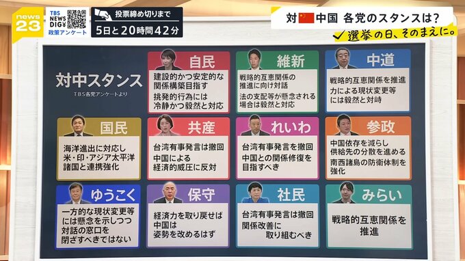 各党の中国とどう向き合うか、スタンスについての公約は以下のようになっています。