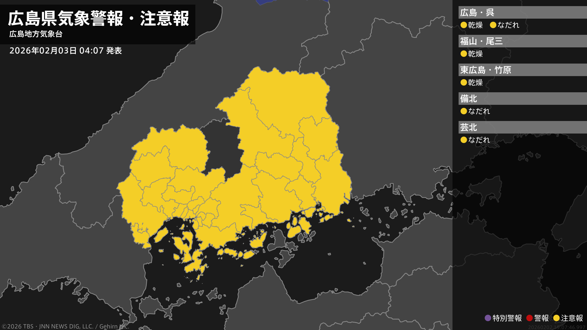 気象台は、午前4時7分に、なだれ注意報を三次市、廿日市市、安芸太田町、北広島町に発表しました。