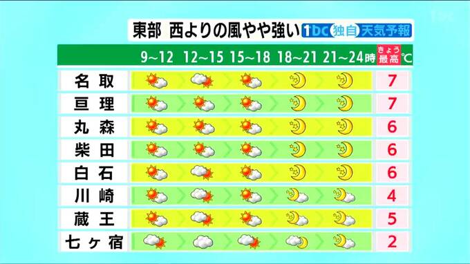 冬型の気圧配置が緩むため、晴れ間が広がってきます。ただし、昼頃から夕方にかけては雲がやや広がりやすいでしょう。この時期らしい寒さとなりそうです。