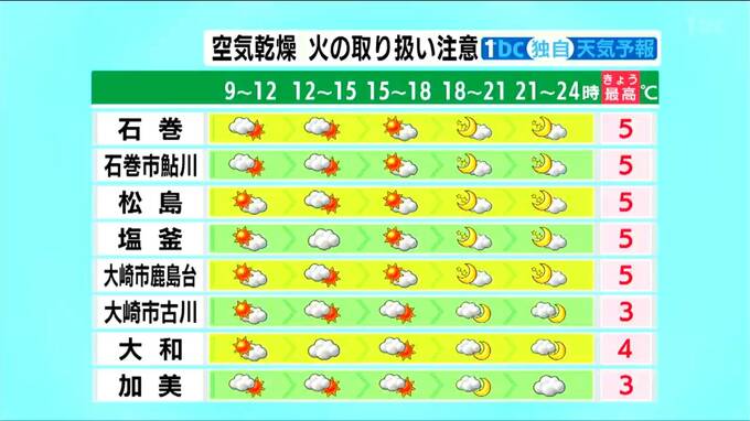 少し北のエリアになってくると、曇りマークが増えてきます。天気の大きな崩れはありませんが、加美や大和などでは弱い雪が降るかもしれません。火災が相次いでいますので、火の取り扱いにご注意ください。