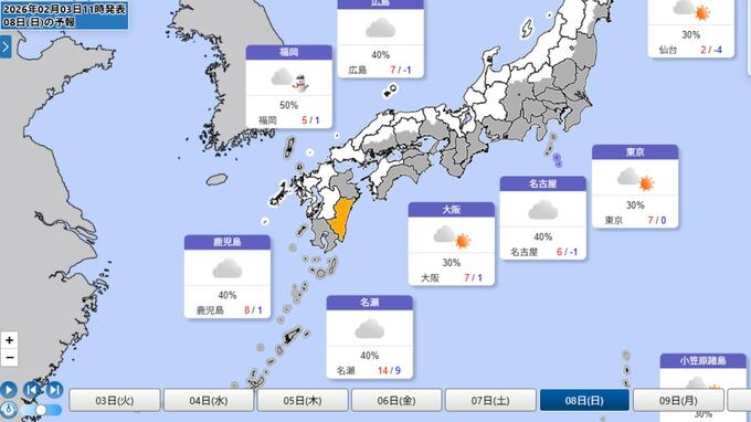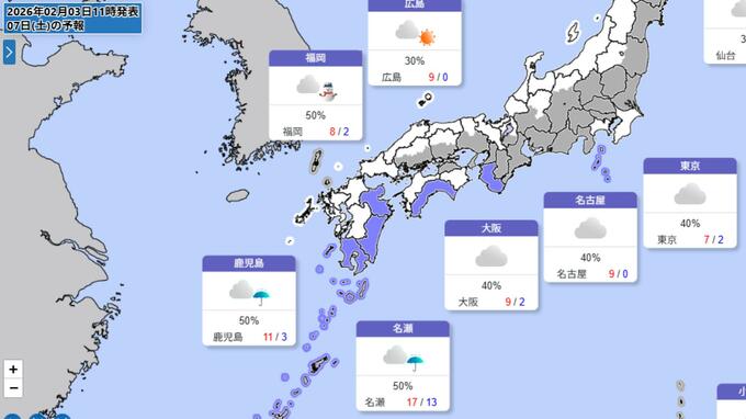 【九州の雪は?】7日(土)から雪予想 8日の投票日も九州北部で雪のおそれ 雨雪シミュレーション 長崎放送 2026年2月3日(火) 12:00 国内 7日(土)・8日(日)「雪マーク」どこで降る? ◆雨雪シミュレーション(九州) ◆雨雪シミュレーション(全国) 気象庁が発表している週間予報では、7日(土)から8日(日)にかけて九州北部を中心に雪が降る予想となっています。 太平洋側でも、強い冬型の気圧配置となることに加え、日本の南に気圧の谷がのびる影響で雪や雨となる可能性があります。