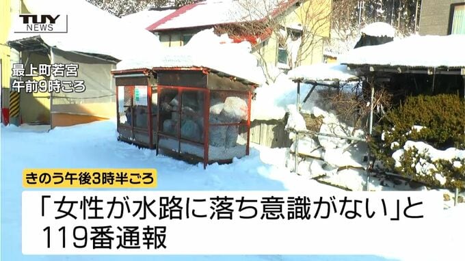 消防や警察によりますときのう午後3時半ごろ、最上町若宮で「80代くらいの女性が水路に落ちていて意識がない」と通行人から119番通報がありました。