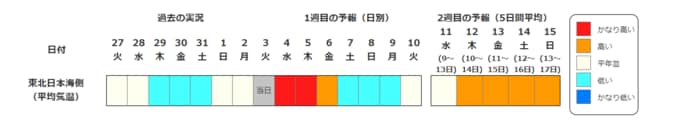 ・2週目の予報は中心の日に前後2日間を加えた5日間の平均(最高気温の5日間平均、最低気温の5日間平均、平均気温の5日間平均)です。平均期間を中心の日の下に表示しています。2週目のかなり高い(かなり低い)は、かなり高い(かなり低い)気温となる確率が30%以上のときに表示します。