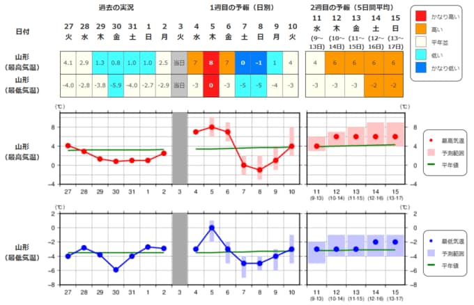 ・最近1週間の実況と今後2週間先までの気温の推移を表示しています。