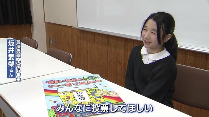 最優秀賞 西合志中央小学校5年生 坂井愛梨さん「みんなが幸せになれるような街、国にしていきたい。みんなに投票してほしい」