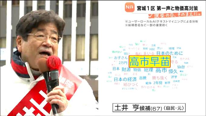 自民党の元職・土井亨さんです。最も大きく表示されたのは、親交が深いという高市早苗総理の名前。高市総理の名前を10回以上口にし、国と地域の経済を強くしていくと訴えました。