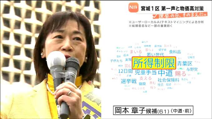 中道改革連合の前職・岡本章子さんです。最も大きく表示されたのは、「所得制限」です。児童手当の所得制限を撤廃したと実績をアピールし、障害児への手当などに残る所得制限を無くしたいと訴えました。
