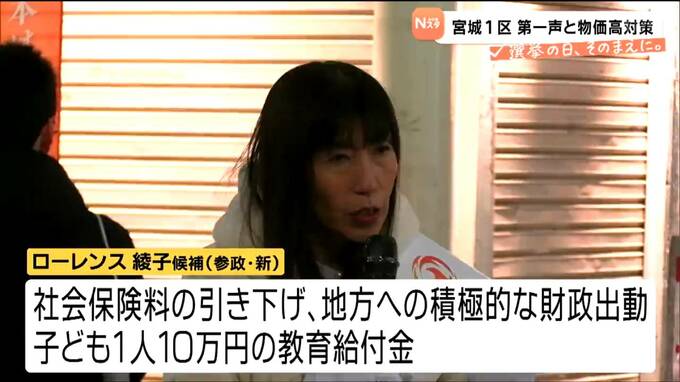 参政党の新人・ローレンス綾子さんは、社会保険料の引き下げや地方への積極的な財政出動、子ども1人につき10万円の教育給付金などを訴えています。