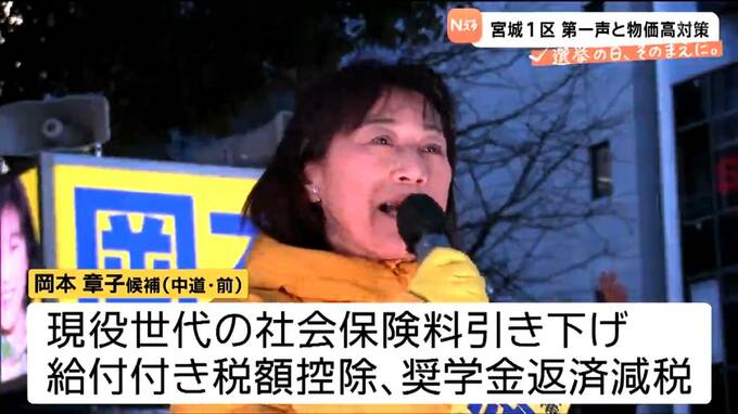 中道改革連合の前職・岡本章子さんは、現役世代の社会保険料引き下げや、給付付き税額控除の創設、奨学金返済減税などの生活支援策に力を入れるとしています。