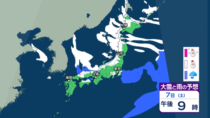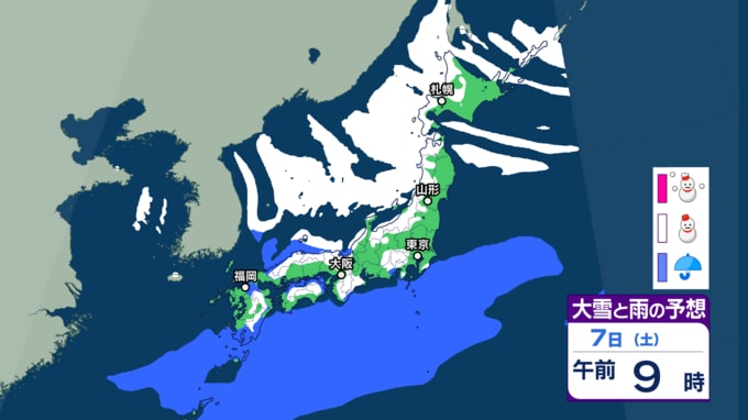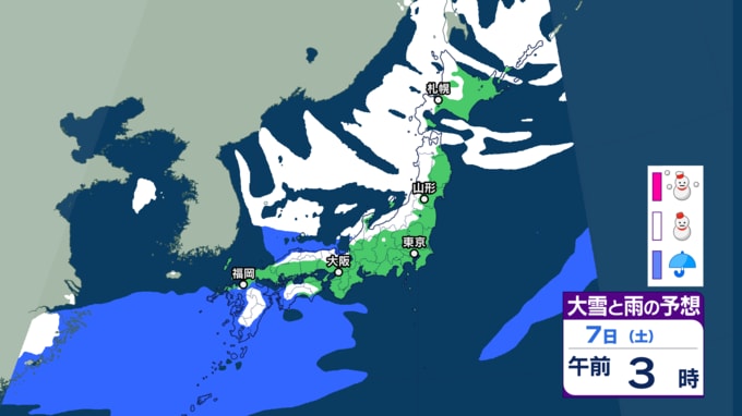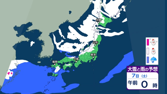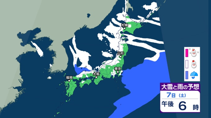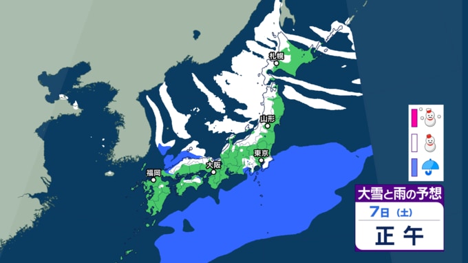 【大雪・天気】衆議院選挙の投開票日は広範囲で雪か...日本海側では警報級の大雪も 寒波直撃で関東でも雪の可能性 【6日~8日の降雪シミュレーション】 テレビユー山形 2026年2月4日(水) 15:00 国内 ■雪と雨のシミュレーション(7日)