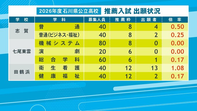 【全校の倍率2026】石川県公立高校入試「推薦入試」県立工業・デザインが1.92倍 小松市立・普通が1.47倍…令和8年度の出願状況 北陸放送 2026年2月3日(火) 18:53 国内 【学校別の一覧】田鶴浜・衛生看護 1.08倍、志賀・普通 0.50倍 ▼志賀:普通科 0.50倍、ビジネス・福祉コース 0.25倍 ▼七尾東雲:機械システム科 0.00倍、演劇科 0.00倍、総合学科 0.17倍 ▼田鶴浜:衛生看護科 1.08倍、健康福祉科 0.17倍