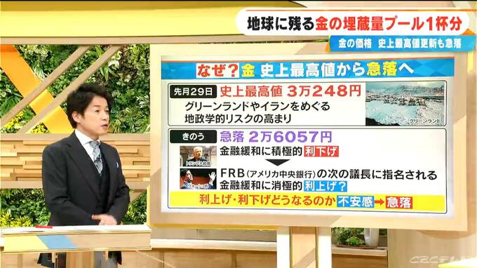 まず、3万円超えの史上最高値については、グリーンランドをめぐるアメリカとヨーロッパの対立や、イランの核開発問題など世界的な政治的緊張が高まっていて、安全な金を買うことで資金を守ろうという動きが活発になったのではないかと。