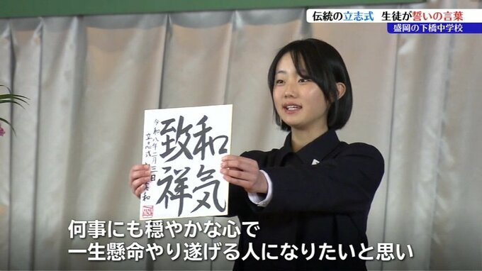 節目の式に参加した2年生68人は、自分の今後の生き方や目標、夢をそれぞれが選んだ四字熟語などの言葉とともに大きな声で発表しました。
