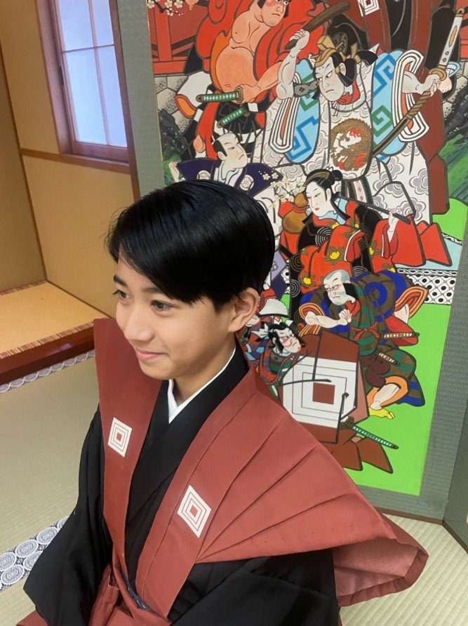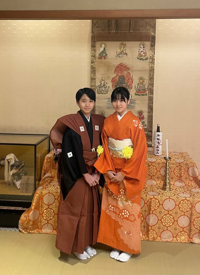 また、「記念写真」と題して勸玄さん、麗禾さんの2ショットの写真も公開しています。勸玄さんは凛々しい赤茶色の裃姿、麗禾さんは橙を基調とした華やかな花柄の着物に身を包み、伝統行事に彩りを添えています。