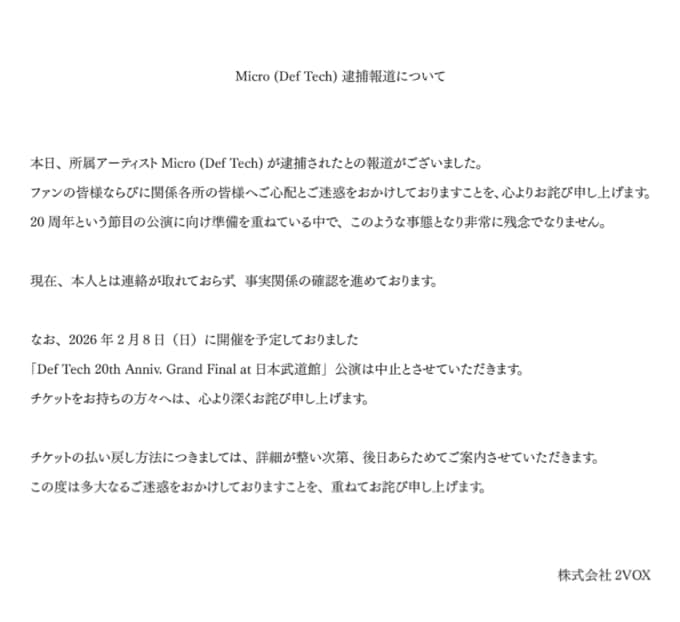 「20周年という節目の公演に向け準備を重ねている中で、このような事態となり非常に残念でなりません」「2026年2月8日(日)に開催を予定しておりました『Def Tech 20th Anniv. Grand Final at 日本武道館』公演は中止とさせていただきます。チケットをお持ちの方々へは、心より深くお詫び申し上げます。」と日本武道館での公演を中止することも発表し、重ねて謝罪しました。
