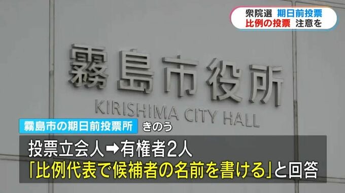 衆議院議員選挙は鹿児島県内各地で期日前投票が行われていますが、霧島市の投票所できのう2日、比例代表の投票用紙に候補者の個人名を記入し、投票していたことが分かりました。