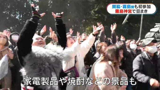きょう3日は国宝・霧島神宮でもおよそ7000袋の福豆がまかれました。家電製品や焼酎などの景品が書かれた紙が付けられており、参拝者が歓声をあげながら拾っていました。