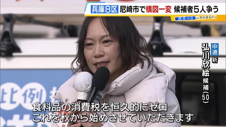 (中道・新人 弘川欣絵候補)「食料品の消費税を恒久的にゼロ。これを秋から始めさせていただきます」