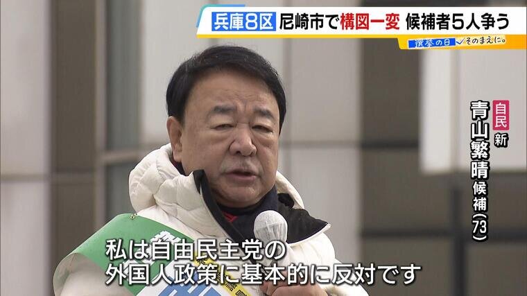 (自民・新人 青山繁晴候補)「自由民主党の小選挙区って30年やっていない。僕のことを多少ご存知の方がいても、テレビに出演していたことがあっても、『小選挙区で尼崎で何してんの?』と。僕が主権者でもそう思う。これはたぶん最後の日までついてまわる。だから簡単に30年のロスは埋まらないです」