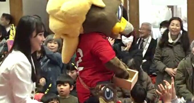 今回はゲストとしてツエーゲン金沢のマスコットキャラクター・「ゲンゾー」や、以前、白山さんで巫女として働いていた経験があるという、ほくりくアイドル部の辰巳未来春(たつみ・みくる)さんが招かれ、参拝者とふれあいながら豆を撒いていました。