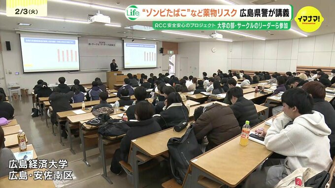 カープの羽月容疑者がいわゆる「ゾンビたばこ」を使用した疑いで逮捕されましたが、若者への薬物まん延が懸念されています。薬物のリスクを知ってもらおうと広島県警の薬物事件の担当者が大学生に講義しました。