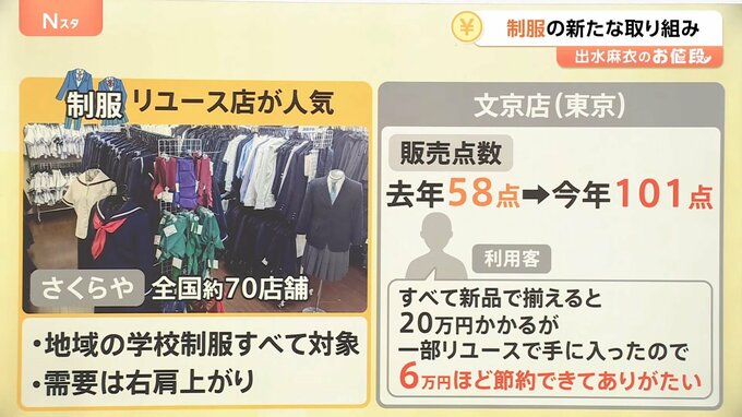 全国に約70店舗を展開する「さくらや」では、地域の学校制服すべてが対象で、買取や販売を行っています。需要は上がっているそうです。