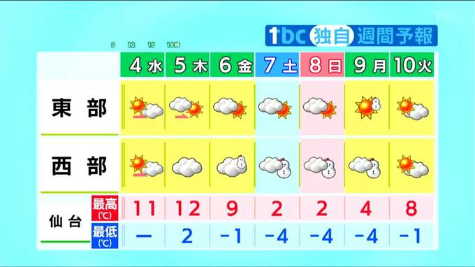 【4日宮城の天気】仙台で20日ぶりに10℃越えに 気温上昇で3月並みの陽気で"花粉”も飛び始めるか…tbc気象台 東北放送 2026年2月4日(水) 11:37 国内 天気 週間予報 土曜から厳しい寒さ戻る 東部は晴れる日が多いですが、西部は金曜から月曜にかけては強い寒気の影響で雪が降りやすいでしょう。金曜日までは比較的暖かい日が続きますが、土曜日からは厳しい寒さが戻ってくる見込みです。