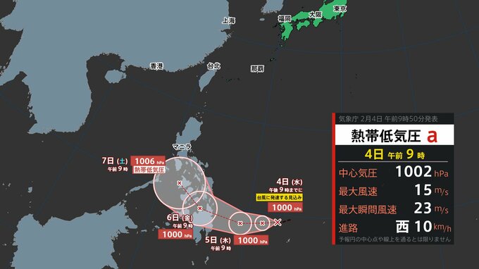 「熱帯低気圧」が、フィリピンの東の海上のカロリン諸島で発生しました。この「熱帯低気圧」は4日(水)午後9時までに「台風」に発達する見込みです。