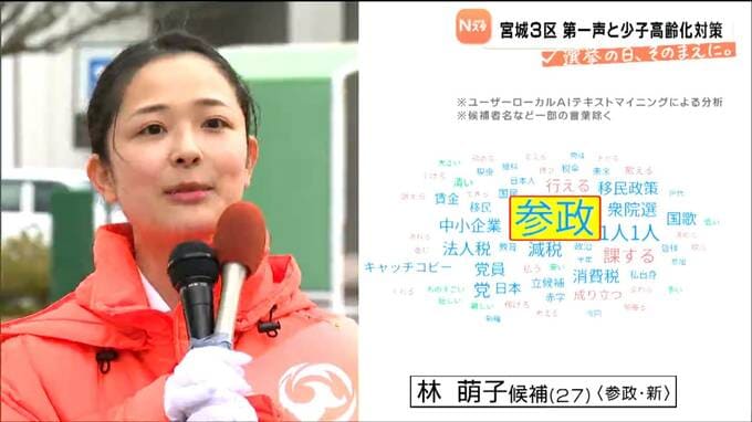 参政党の新人・林萌子さんです。最も大きく表示されたのは「参政」。参政党に出会い政治に興味を持ったと話し、消費税の段階的廃止や日本を誇りに思える教育など党の政策実現を訴えました。