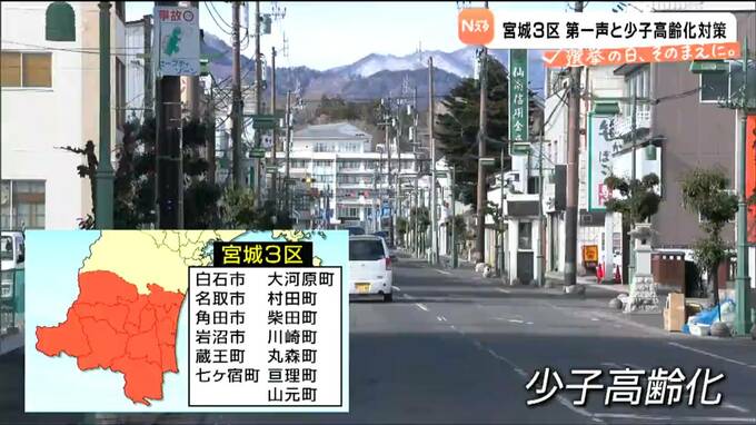 仙台市より南側の13市町で構成される宮城3区。地域課題のひとつが「少子高齢化」です。県内の市町村の高齢化率は上位5つのうち4つが宮城3区で、いずれも4割を超えています。