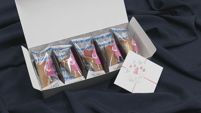 定番商品のラングドシャにホワイトチョコクリームを搾り、乾燥させたイチゴを乗せた「グレイシア」をはじめ、9種類の商品が並びます。