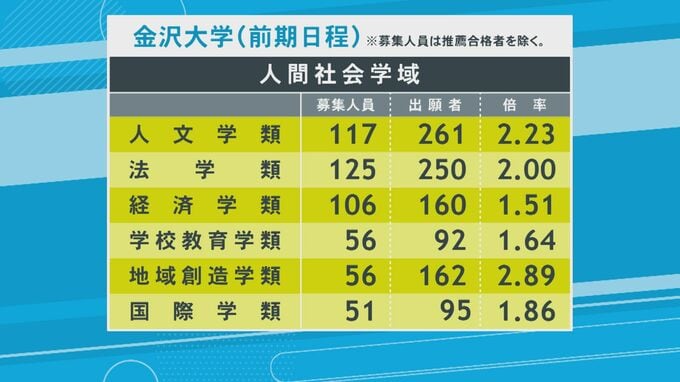 金沢大学一般選抜・志願状況2026【確定】最も倍率が高いのは医学類で4.03倍 北陸放送 2026年2月4日(水) 18:20 国内 学域別の一覧【人間社会学域】 人間社会学域は、511人の募集に対し1020人が出願しています。倍率は2.00倍です。