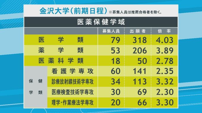 金沢大学一般選抜・志願状況2026【確定】最も倍率が高いのは医学類で4.03倍 北陸放送 2026年2月4日(水) 18:20 国内 学域別の一覧【医薬保健学域】 医薬保健学域は、294人の募集に対し963人が出願しています。倍率は3.28倍です。