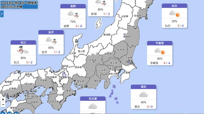 【関東の雪は?】8日(日)東京は降水確率40%「雨か雪」の可能性 千葉・神奈川に雪マーク 週末は西日本で「警報級大雪」のおそれ 雨雪シミュレーション 長崎放送 2026年2月4日(水) 12:35 国内 東京でも雪の可能性 【画像を見る】◆全国 ◆関東 ◆関西 ◆九州 雨雪シミュレーション 週間予報では8日(日)、関東では千葉県、神奈川県で雪の予想となっています。 東京では曇り、降水確率は40%の予想で、最低気温は0℃、最高気温は6℃が予想されています。 8日(日)の予報(気象庁・週間予報) 気象庁によりますと、7日は日本の南を前線を伴った低気圧が東進する見込みです。東日本(関東など)の太平洋側では、7日から8日にかけて雨または雪の降る所があると予想されています。